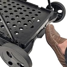 Vouw de wagen eenvoudig plat in seconden met een druk op de knop. Voor een compacter formaat, berg de wielen op in de uitsparing van het onderste plankje. Opgevouwen is de wagen slechts 74x53x10 cm groot.